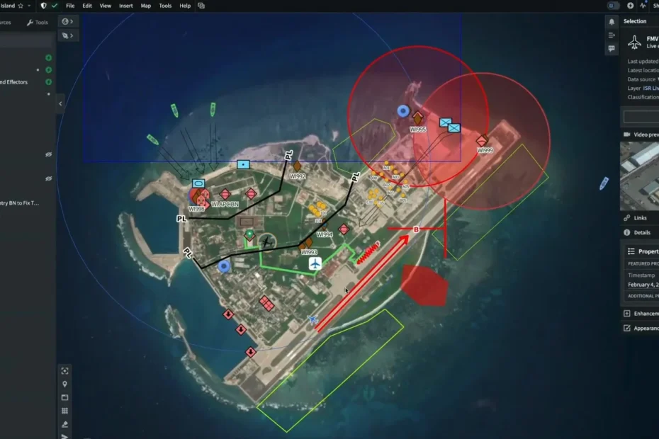A plataforma vai além da identificação, sugerindo opções de ataque com base nos dados cruzados. O operador escolhe uma das opções, e toda a operação é iniciada e executada dentro do mesmo sistema, otimizando o fluxo de trabalho militar de forma inédita.